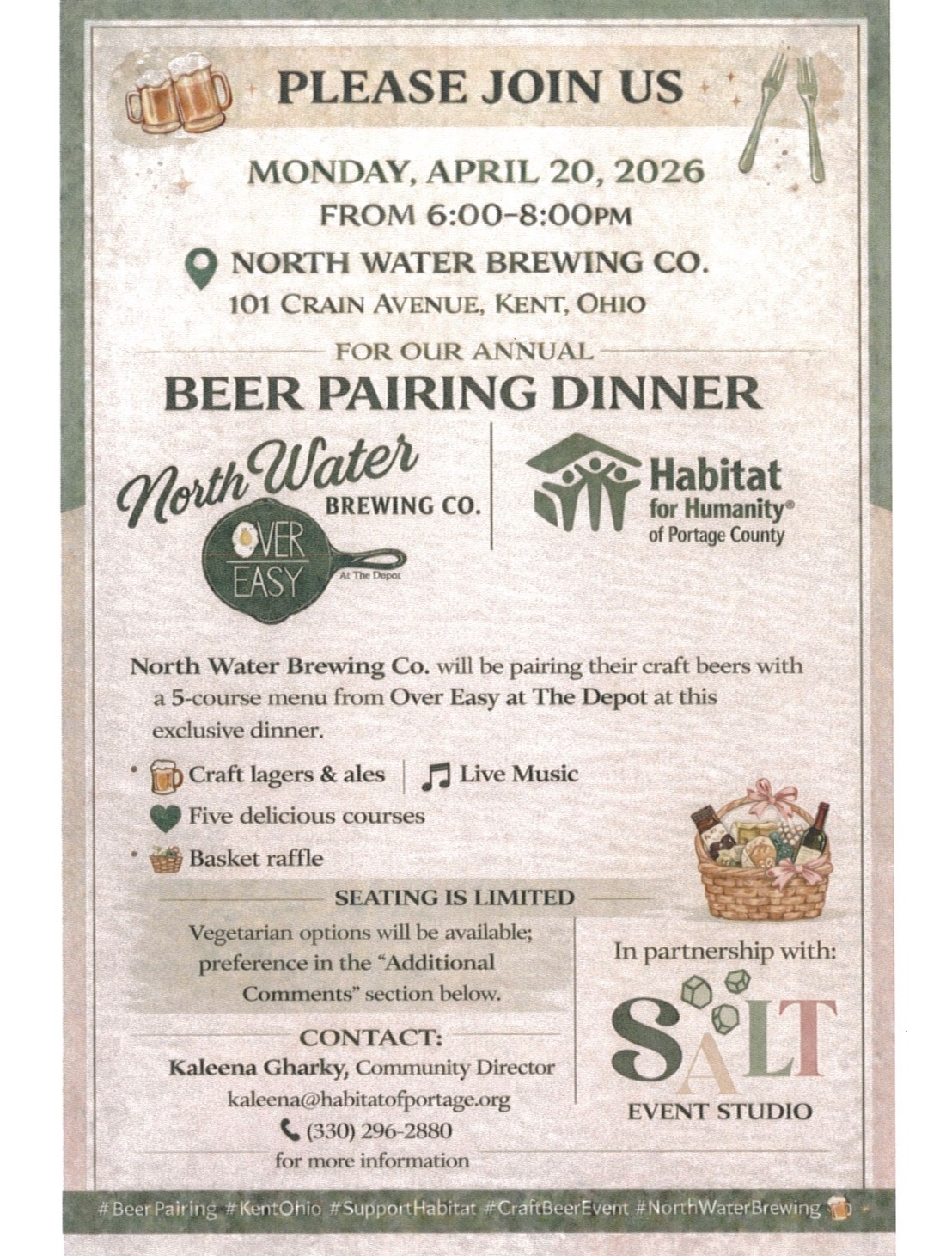 Save the date! The 2026 Habitat For Humanity Beer Pairing Dinner, in collaboration with North Water Brewing and Over Easy at the Depot.